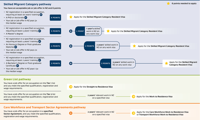 - Cục Di trú New Zealand có liệt kê rõ 3 lộ trình xin cư trú. Các yêu cầu, cách tính điểm được liệt kê rất rõ ràng, dễ hiểu.